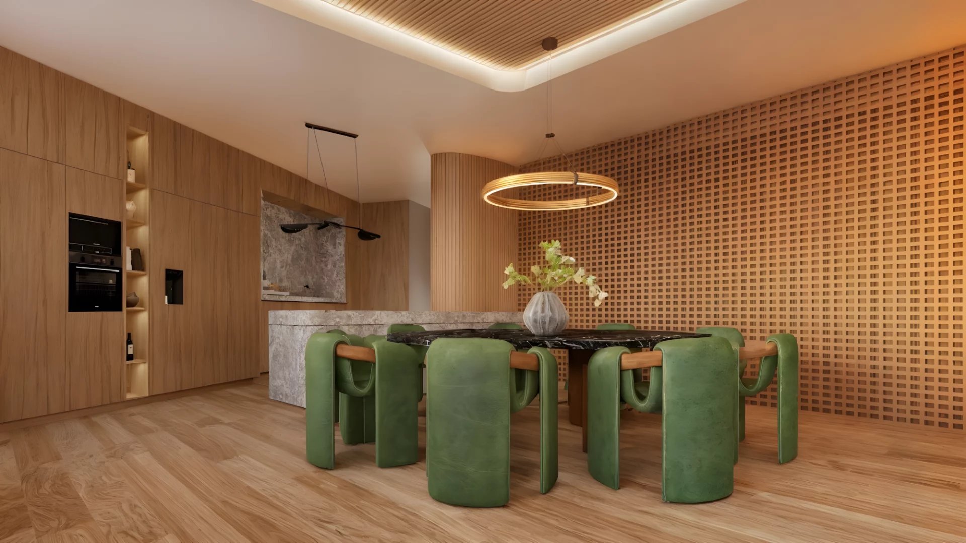 With ceilings over three meters high and 11 panoramic windows that flood every room with light, Casa Atelier offers a spacious, balanced and luminous space. Its large open-plan living room connects to the dining areas and a designer kitchen with a central island, conceived for those who value functional elegance.