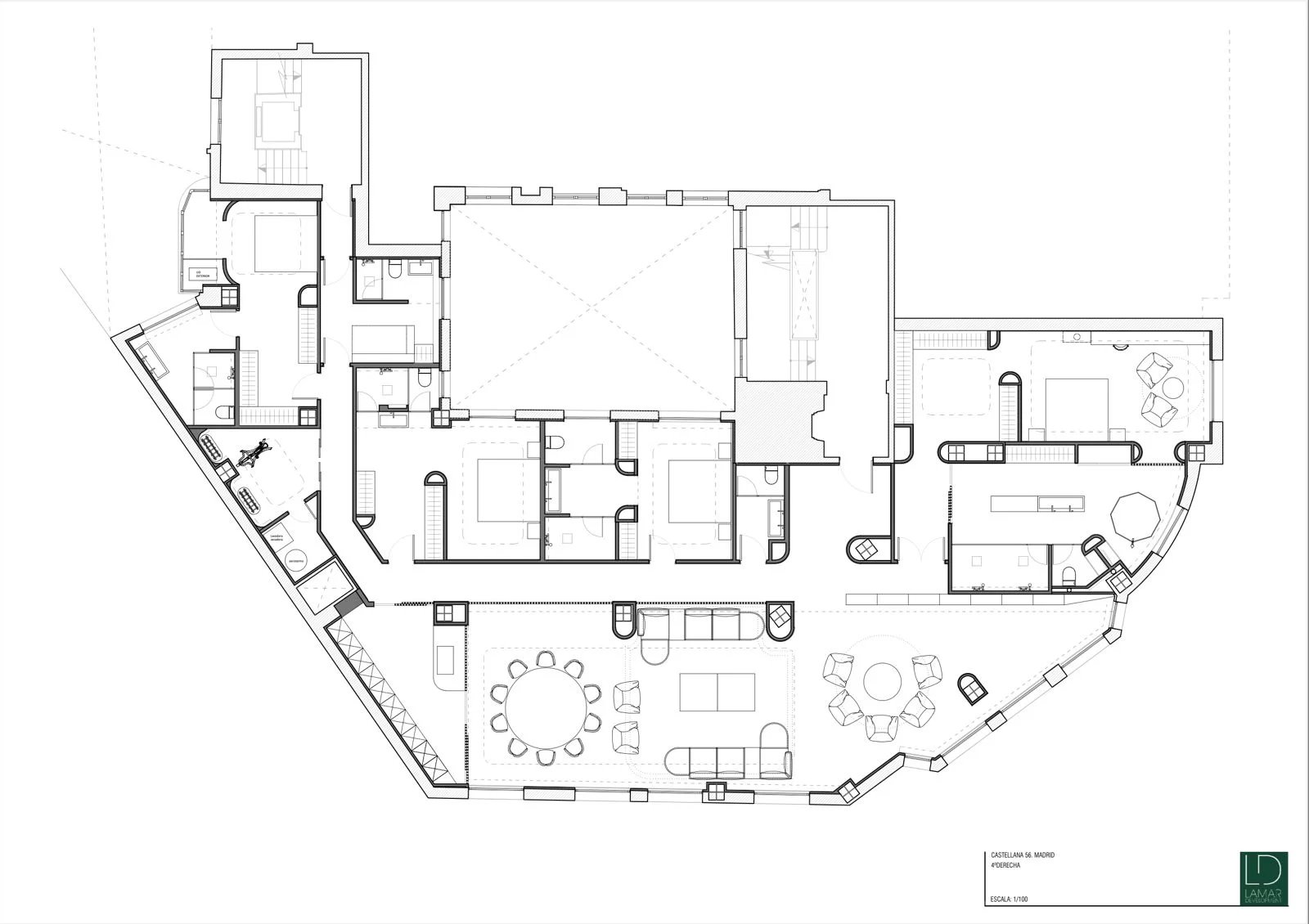 At number 56 Paseo de la Castellana, in the heart of the Salamanca neighborhood, is Casa Atelier, a unique 500 m² residence that elevates the concept of urban sophistication to its maximum expression. Located on the fourth floor of a historic building designed by renowned architect Luis Gutiérrez Soto, the property combines the architectural charm of classic Madrid with a contemporary vision of comfort and design.