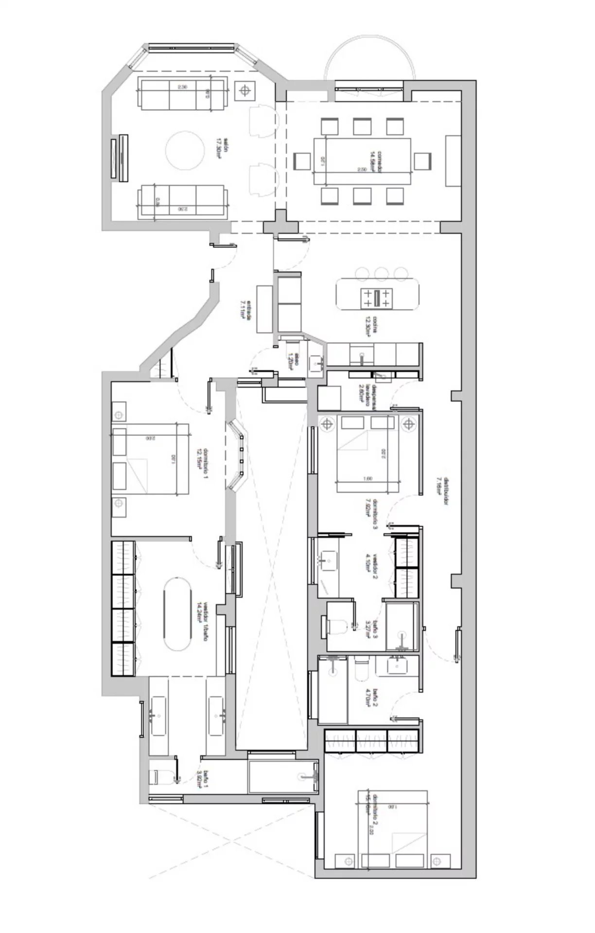 The social area consists of a living-dining room with a semi-integrated kitchen and a guest toilet, creating a spacious, comfortable and contemporary space. The sleeping area is divided into two areas: on the one hand, a large master suite with dressing room and bathroom; on the other, two additional bedrooms, both with en-suite bathrooms.