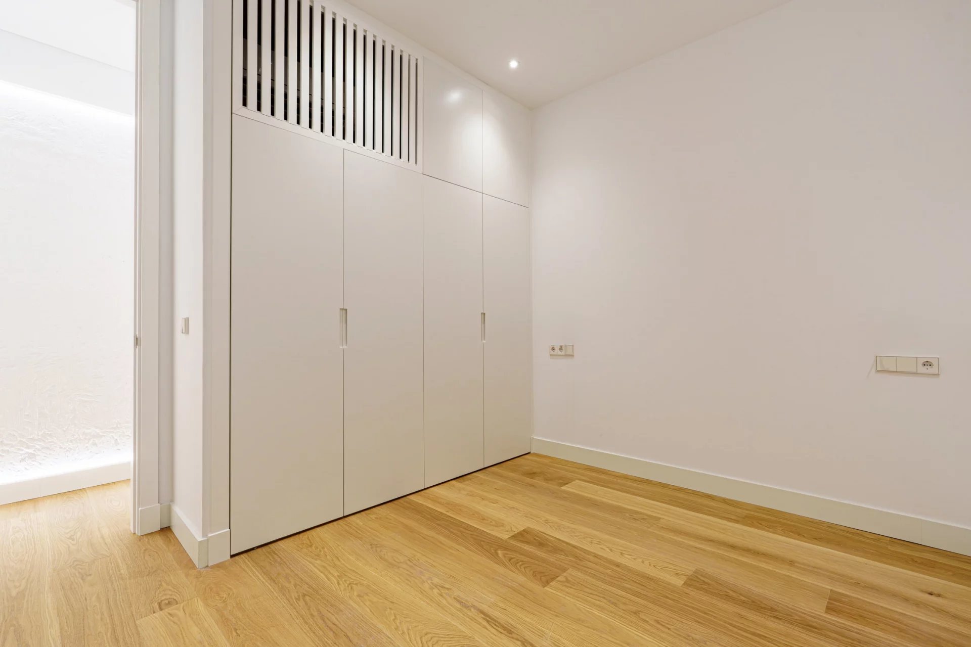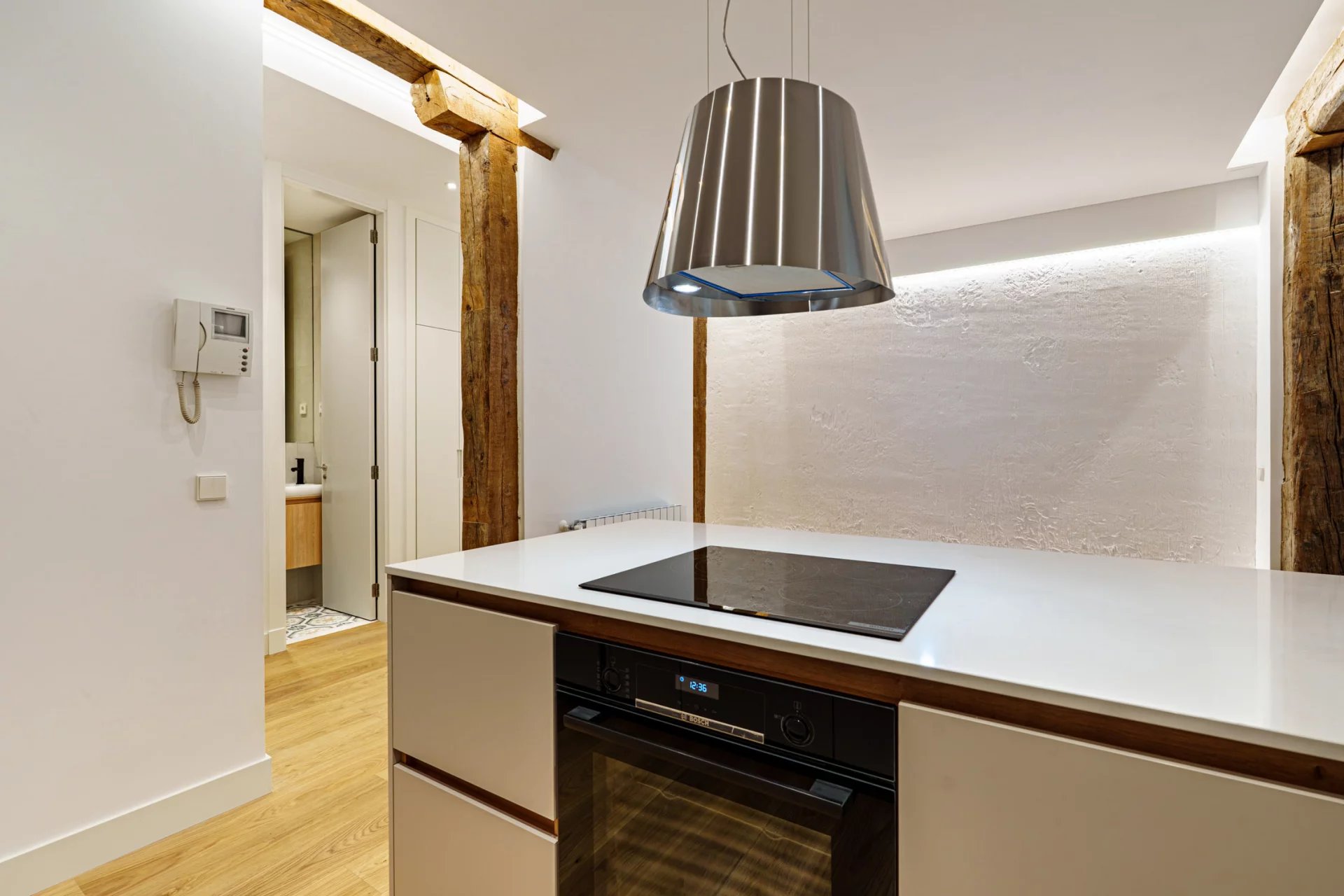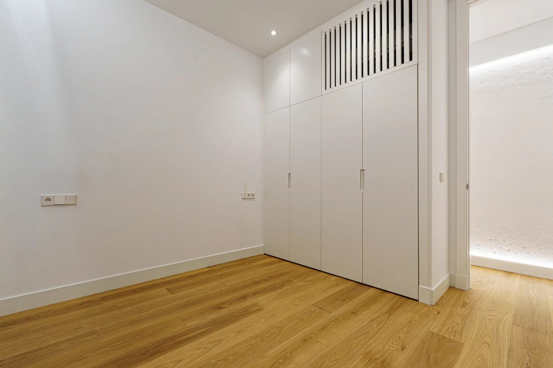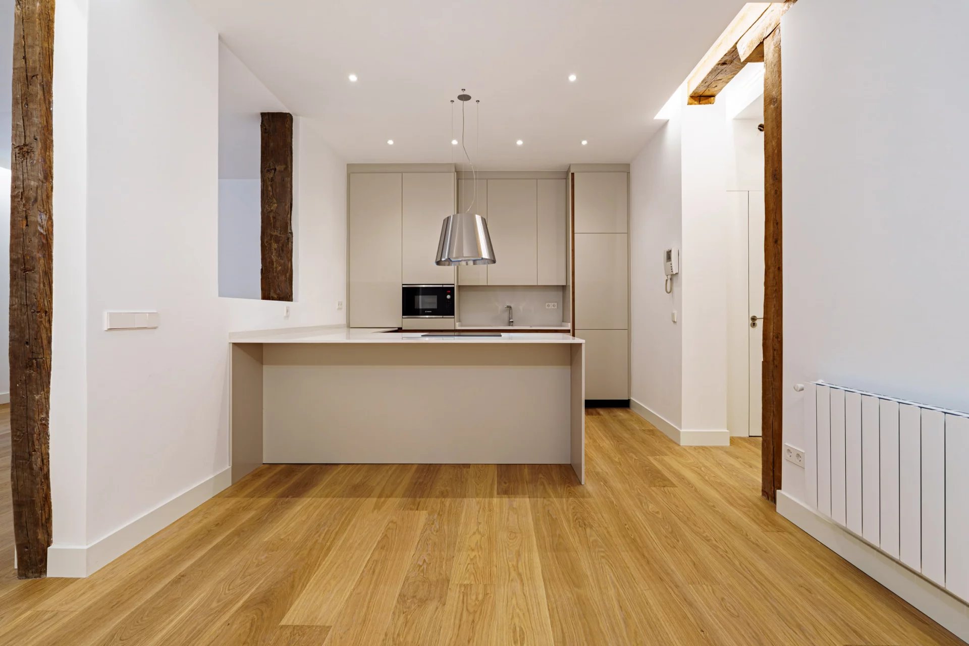 The apartment is distributed in three bedrooms, two bathrooms and a guest toilet, plus a spacious living room with balconies overlooking the boulevard and an open kitchen design with central island and Bosch appliances of last generation. The renovation combines natural wood, indirect lighting and original exposed beams, preserving the soul of the building with a contemporary and elegant aesthetic.