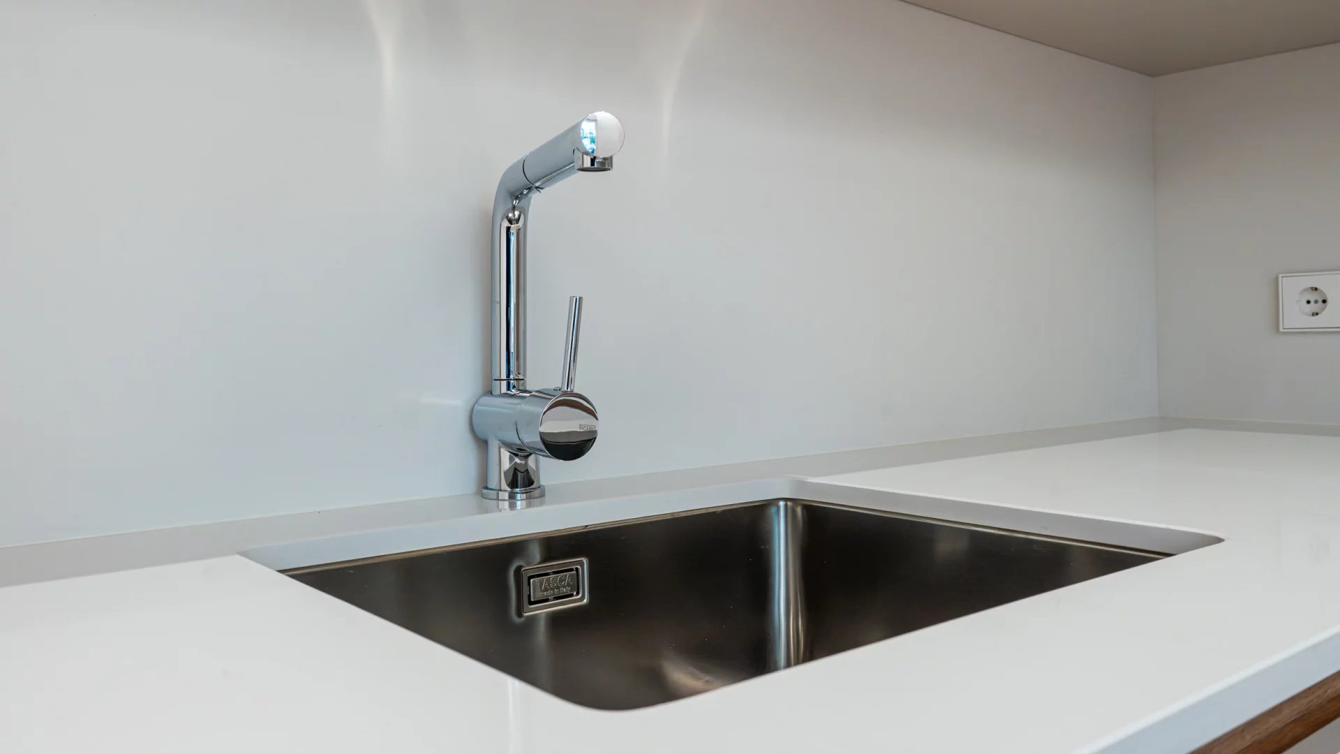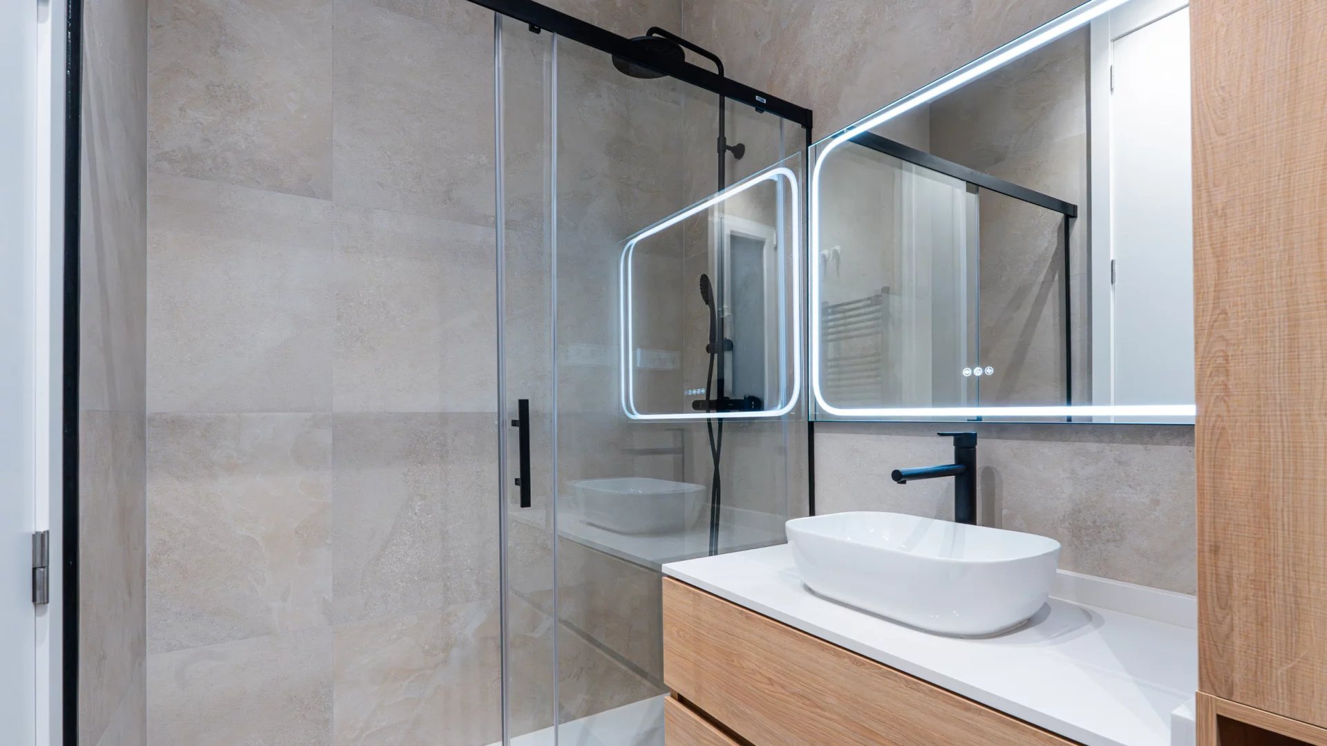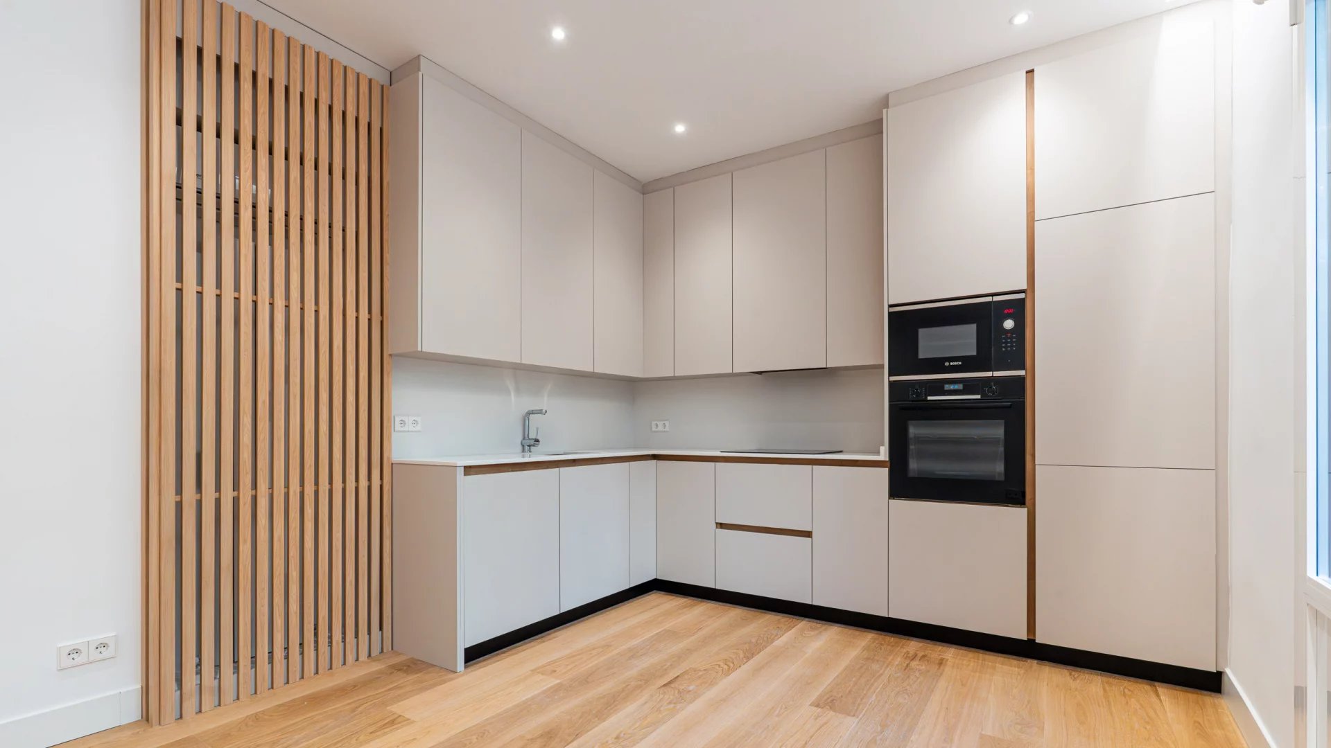 La cocina, de líneas minimalistas y tonos neutros, está equipada con electrodomésticos Bosch integrados y detalles de madera natural que aportan textura y calidez. Los dos dormitorios cuentan con armarios empotrados y dos baños completos con acabados en piedra y grifería negra de diseño, evocando un estilo elegante y actual.