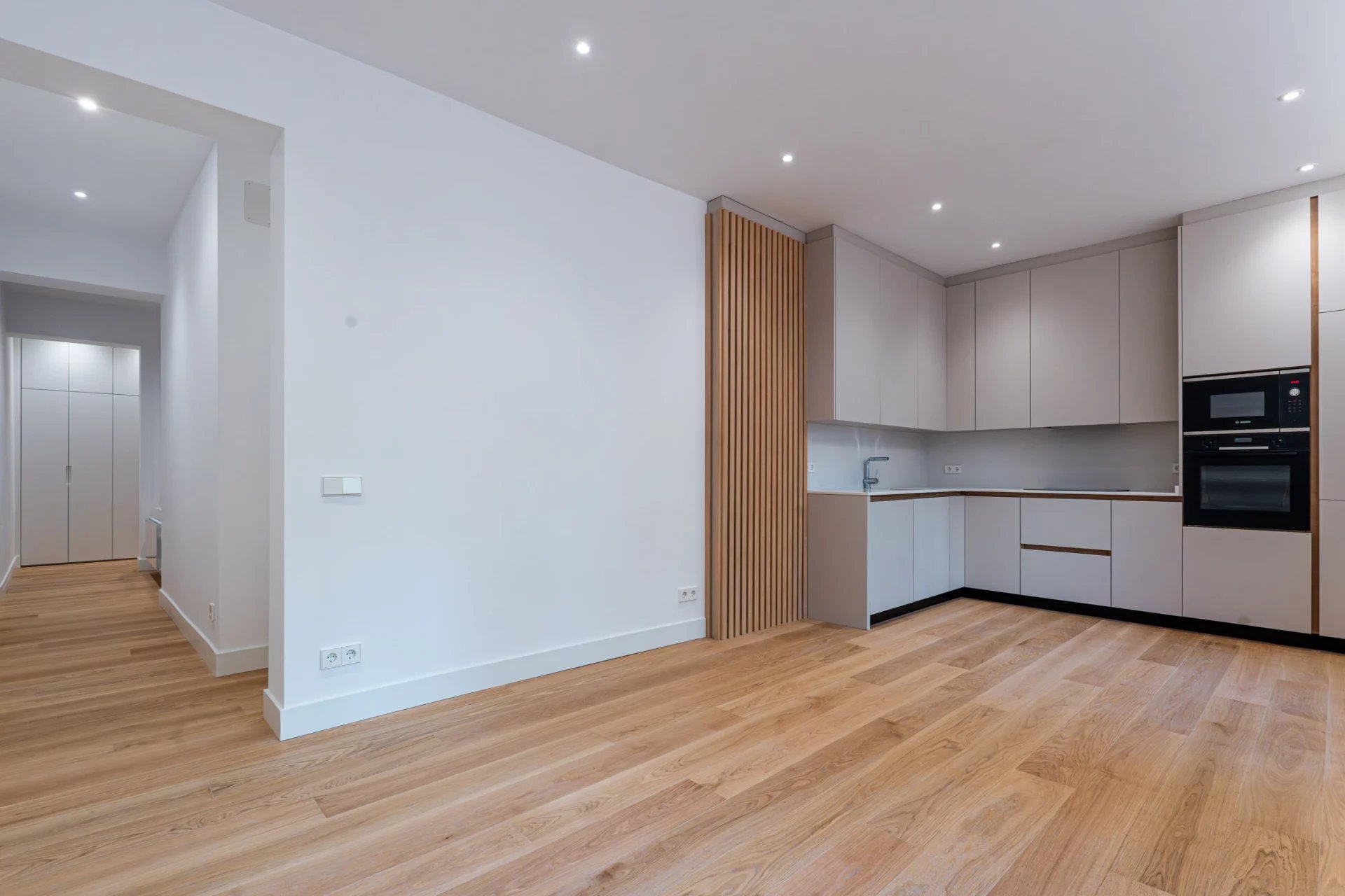 Con una superficie de 79 m², la propiedad combina diseño contemporáneo, materiales nobles y luminosidad natural. El amplio salón con cocina abierta se asoma a Ortega y Gasset a través de ventanales y balcones, creando un ambiente cálido, sofisticado y perfectamente equilibrado entre funcionalidad y estética.